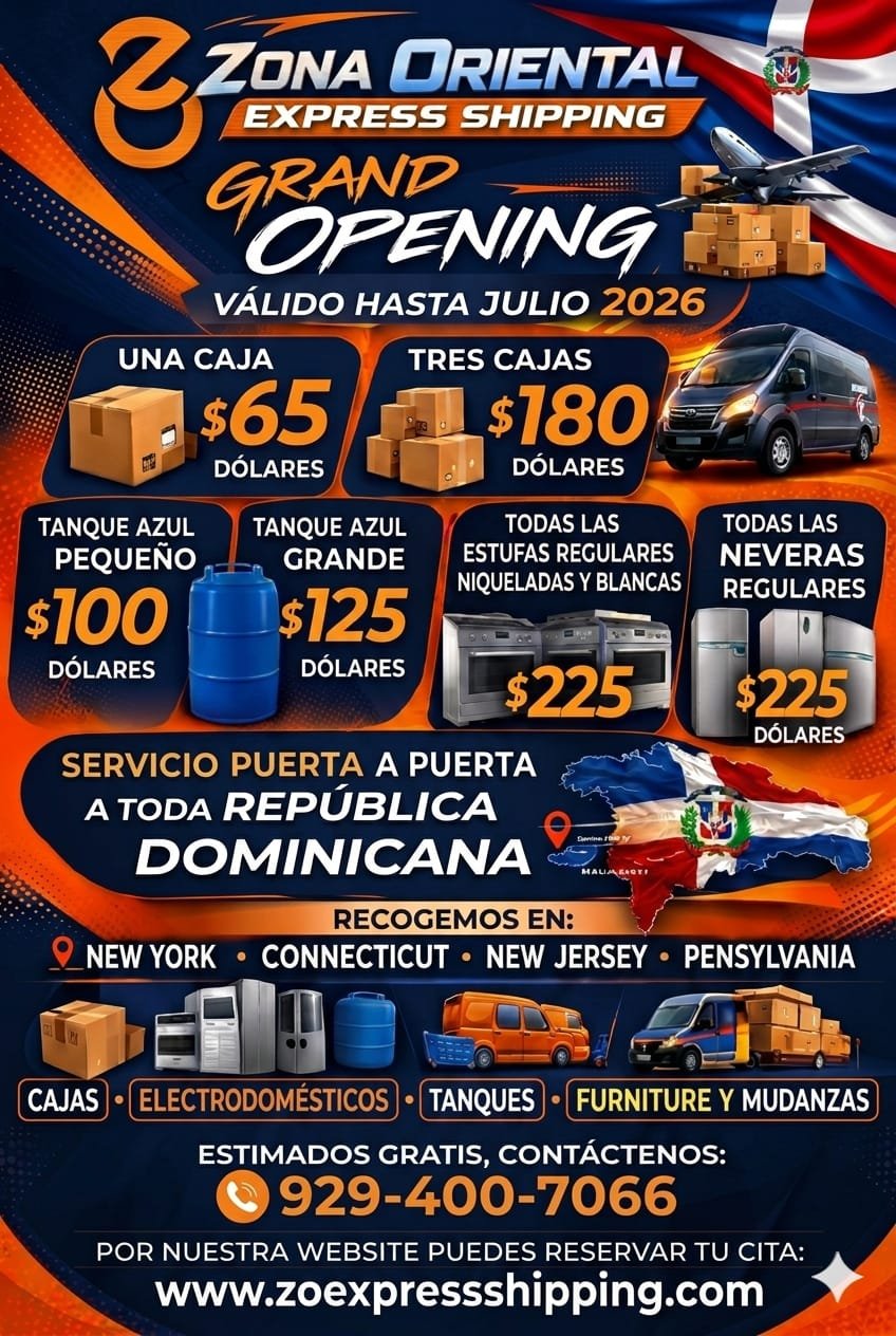 Zona Oriental Express Shipping. Somos Una Empresa Especializadas en el envío de cajas y mas; de puerta a puerta desde Estados Unidos hacia la República Dominicana, ofreciéndole a nuestros clientes la oportunidad realizar envios justo a su destino y en tiempo record.